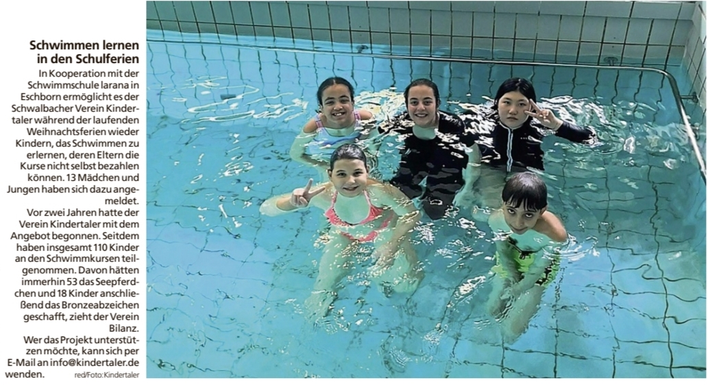 In Kooperation mit der Schwimmschule larana in Eschborn ermöglicht es der Verein Kindertaler seit ca zwei Jahren in den Schulferien das Schwimmen zu erlernen. 110 Kinder aus bedürftigen Familien kamen bisher in den Genuss. Davon haben 53 das Seepferdchen und anschließend 18 das Bronzeabzeichen gemacht. Die anderen Kinder können sich zumindest kurzfristig über Wasser halten. Aktuell stehen wieder zwei Kurse in den Weihnachtsferien an, für die sich 14 Kinder angemeldet haben. Die meisten sind mit Begeisterung dabei, wenngleich die Schwimmmeisterin Frau Dahlmeyer berichtet, dass einige Kinder Probleme mit der Wassergewöhnung hatten. umso wichtiger ist es dem Verein, dieses Projekt fortzusetzten und er freut sich über jede Unterstützung dafür.